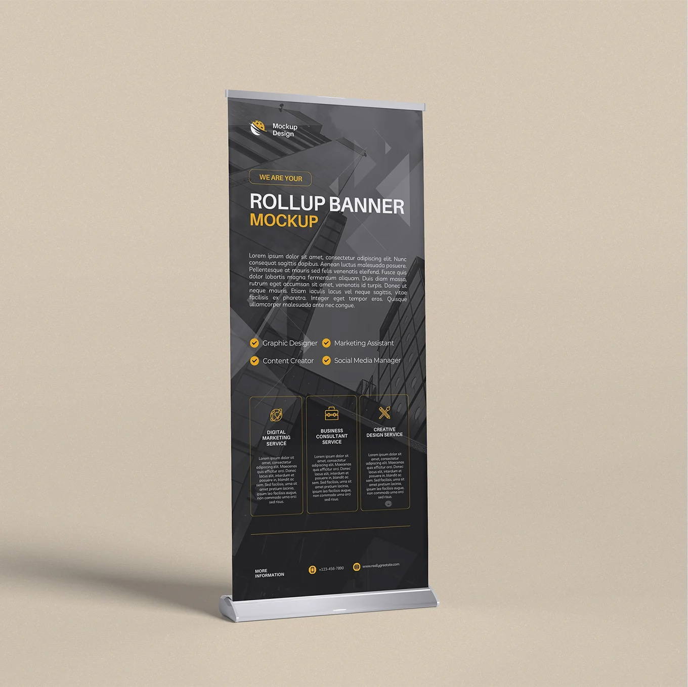 • Sistema roll up económico de aluminio, con banderola impresa, «mástil» de 3 partes y bolsa de transporte.